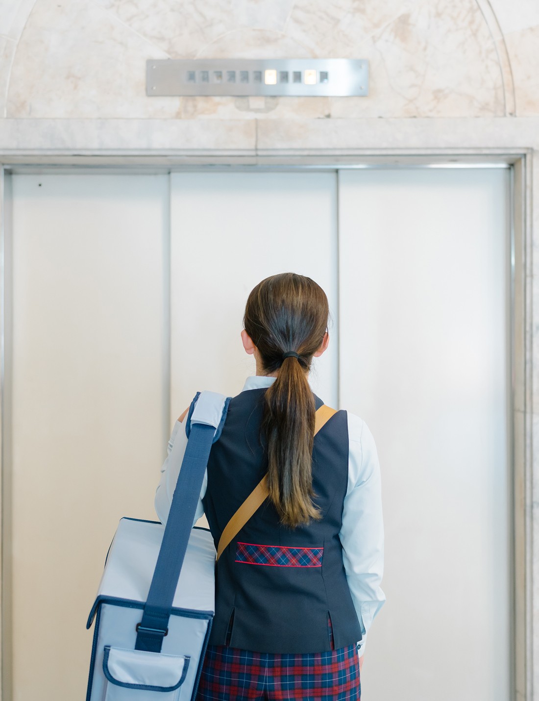 制服に着替えて身だしなみをチェック。