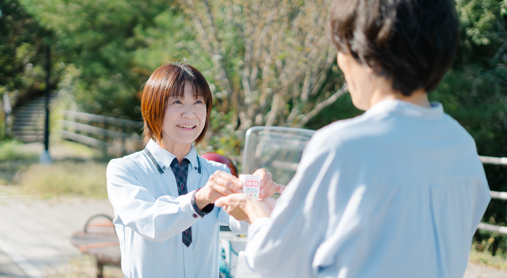 大好きなヤクルトレディの仕事を続けられるよう、日常生活ではできる限り階段を使ったり、休日もマメに体を動かしたりと、体力維持に努めています。地域の皆さまから頼りにされる存在となり、永く皆さまの健康づくりのお役に立ちたいと思っています。